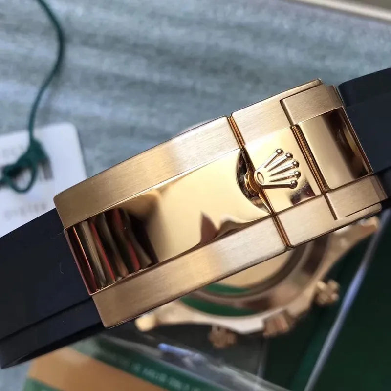 Rx Cosmograph Daytona, 18k Yellow Gold 40mm watch, Reference 116518ln-0048. This model has Champagne/gold colored dial with black sub-dials. Applied black rimmed index hour markers with luminous fill. Polished 18k Yellow Gold hour and minute hands with black centerline and partial luminous fill. Fine printed minute/seconds and fractions of a second track on teh dial perimeter. Polished 18kt Yellow Gold screw-down crown with Rx's patented "Triplock" triple waterproofness system, ensuring that the crown screws down against the Oyster case as securely as a submarine hatch. Screw-down chrono buttons in polished 18kt Yellow Gold. The dial closed by a Scratch-resistant Sapphire Crystal and solid 18kt Yellow Gold made case back. Chronograph/Stop watch function: large central seconds counter hand - accurate up to 1/8th of a second; 30-minute counter sub-dial located at the 3 o'clock position; 12-hour counter sub-dial located at the 9 o'clock position. Continuous running small seconds hand sub-dial located at the 6 o'clock position. The watch is equipped Black "Cerachrom" bezel, made of highly durable ceramic that is extremely hard, highly scratch-resistant, has excellent corrosion resistant properties and is unaffected by ultraviolet rays so the color will not fade. Yellow gold-filled engraved tachymeter scale on the bezel. The watch is mechanical chronograph; self-winding Manufacture Rx 4130 contains 44 Jewels and has an approximate power reserve of 72 running the time only, or 66 hours with the chronograph function running. This model presented on Oysterflex strap of Flexible metal blades overmoulded with high-performance elastomer and a Folding Oysterlock safety clasp with Easylink 5 mm comfort extension link. The water resistance is up to 100m/330ft (10 ATM).